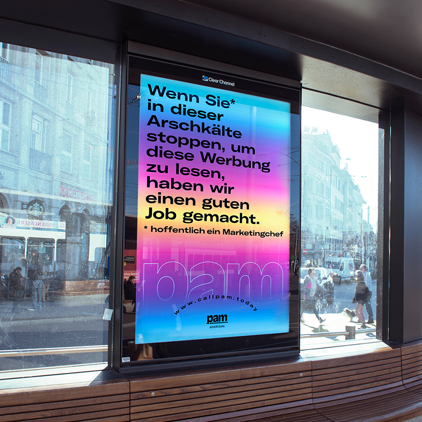 Nach Entschuldigungs-Plakat, Arschkälte-Plakat und Megaposter, dachten wir uns: Warum fragen wir nicht Selfmade-Multimillionär, Bob-Olympiasieger, Schauspieler Hausi Leutenegger als Testimonial für PAM an? Also schrieben wir ihm einen Brief. Und Hausi sagte postwendend zu, weil ihm unser Humor gefiel. Als Gegenleistung wollte Hausi ein Nachtessen in der Kronenhalle. Gewohnt grosszügig auf seine Rechnung.